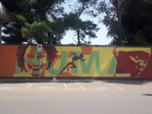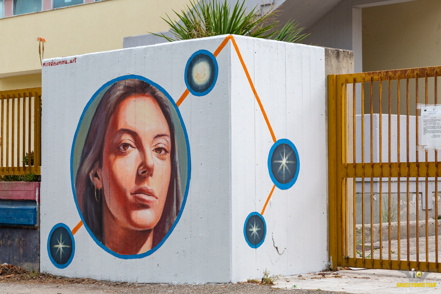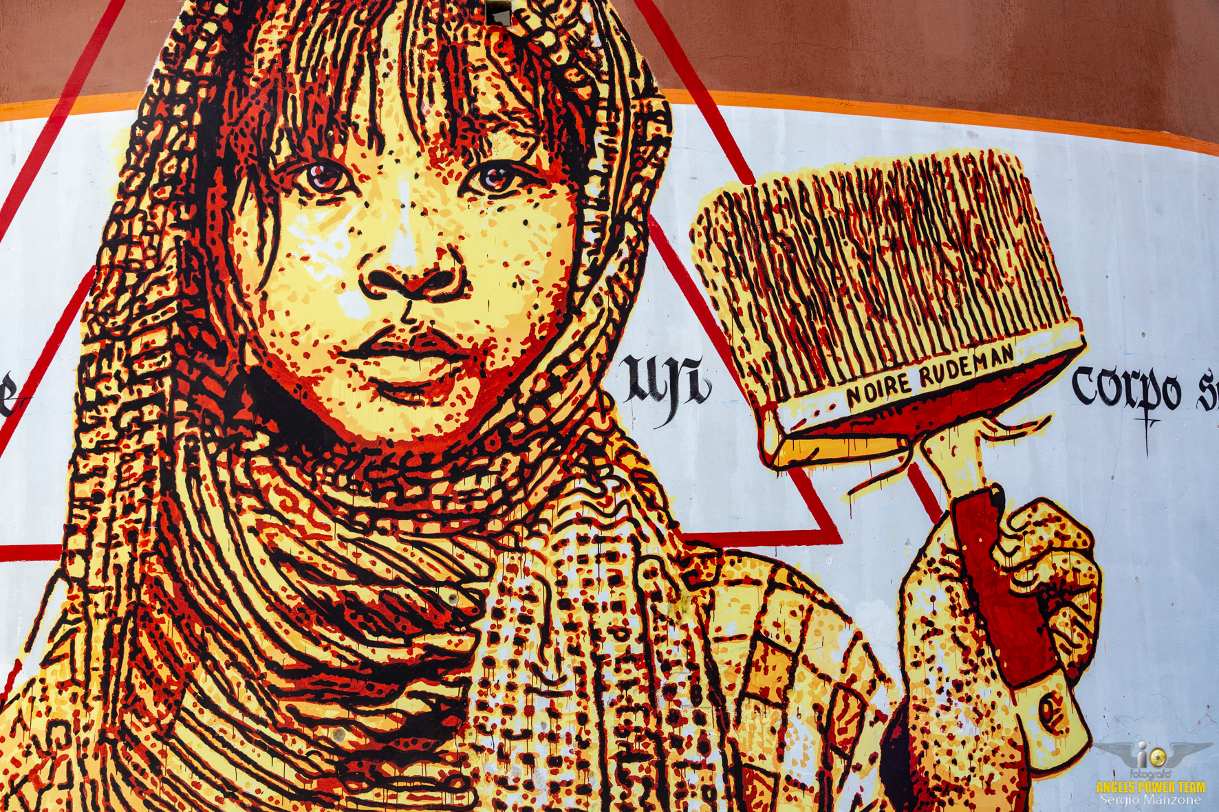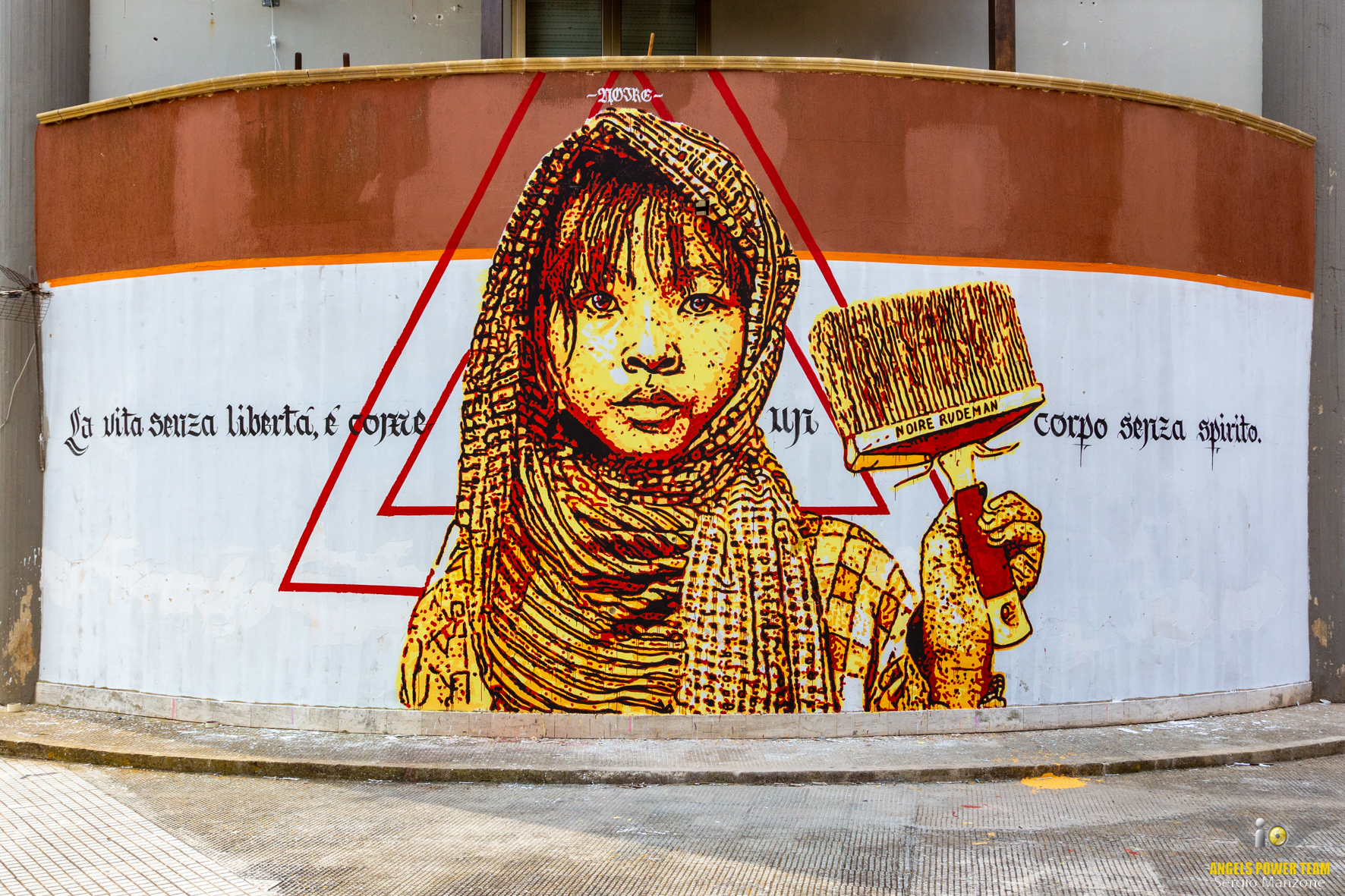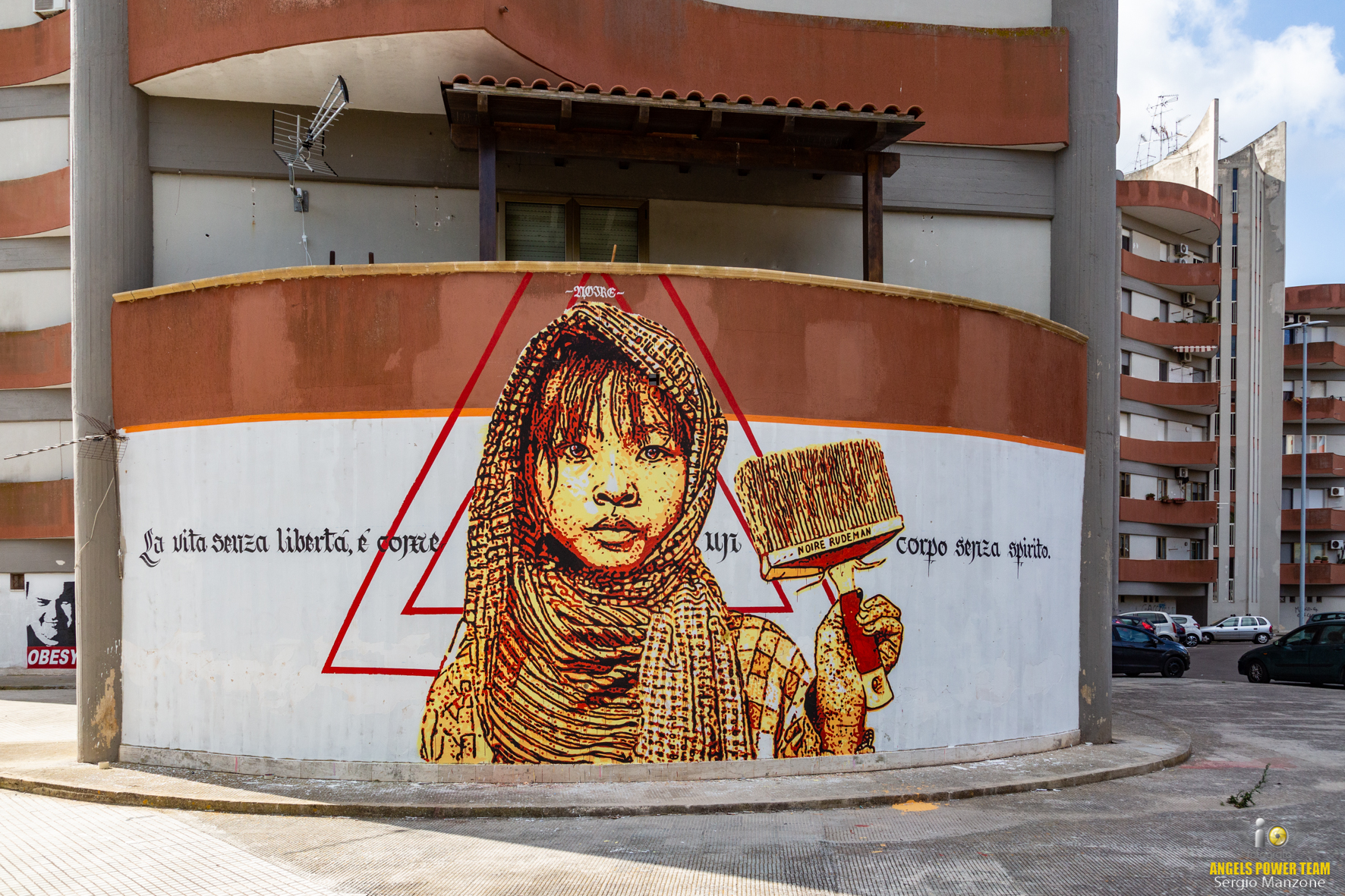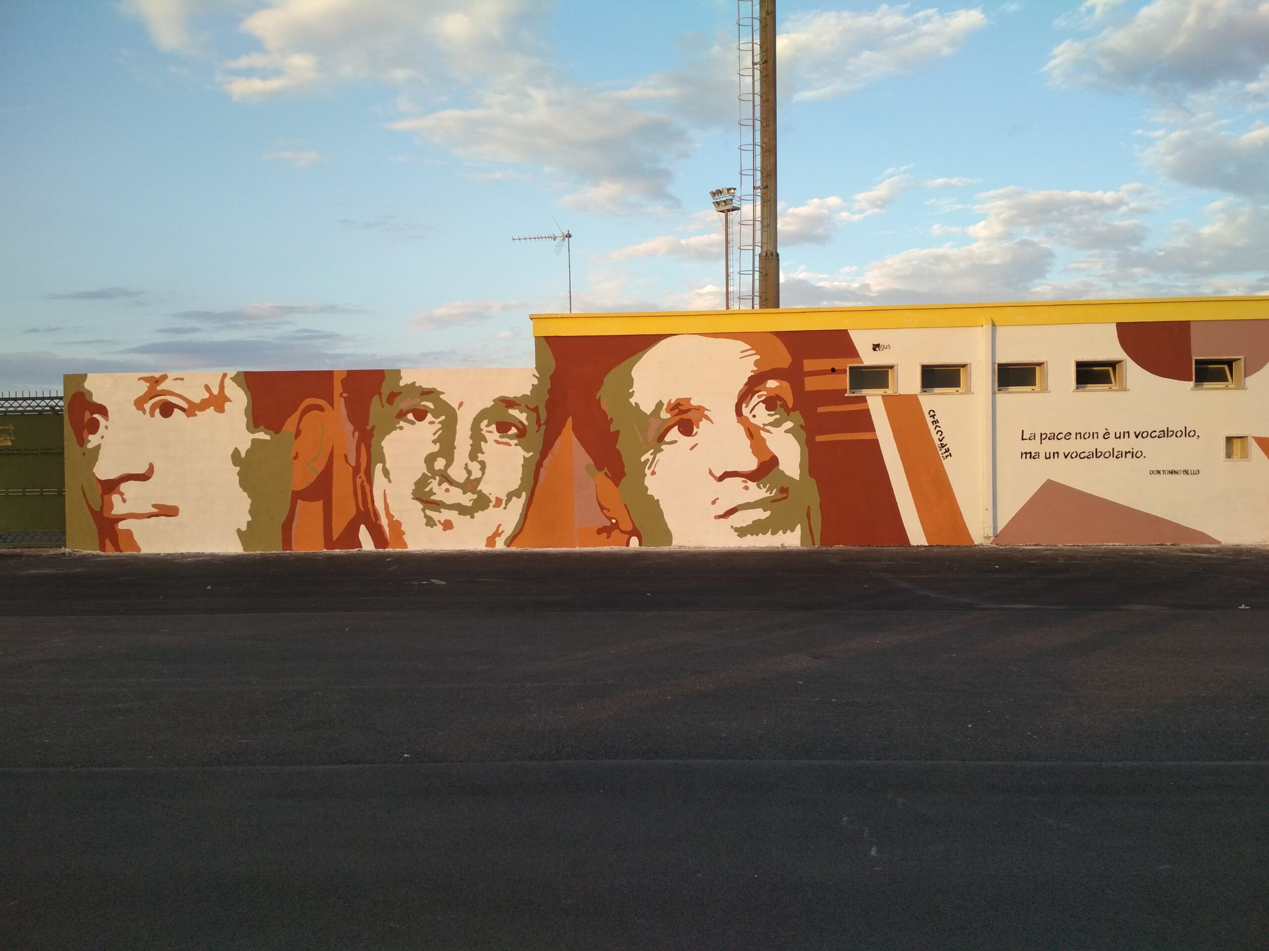 Un murales monumentale, con lo sfondo giallo, rosso e blu, campeggia da 20 Febbraio 2019 nel quartiere 167 di Carmiano.
