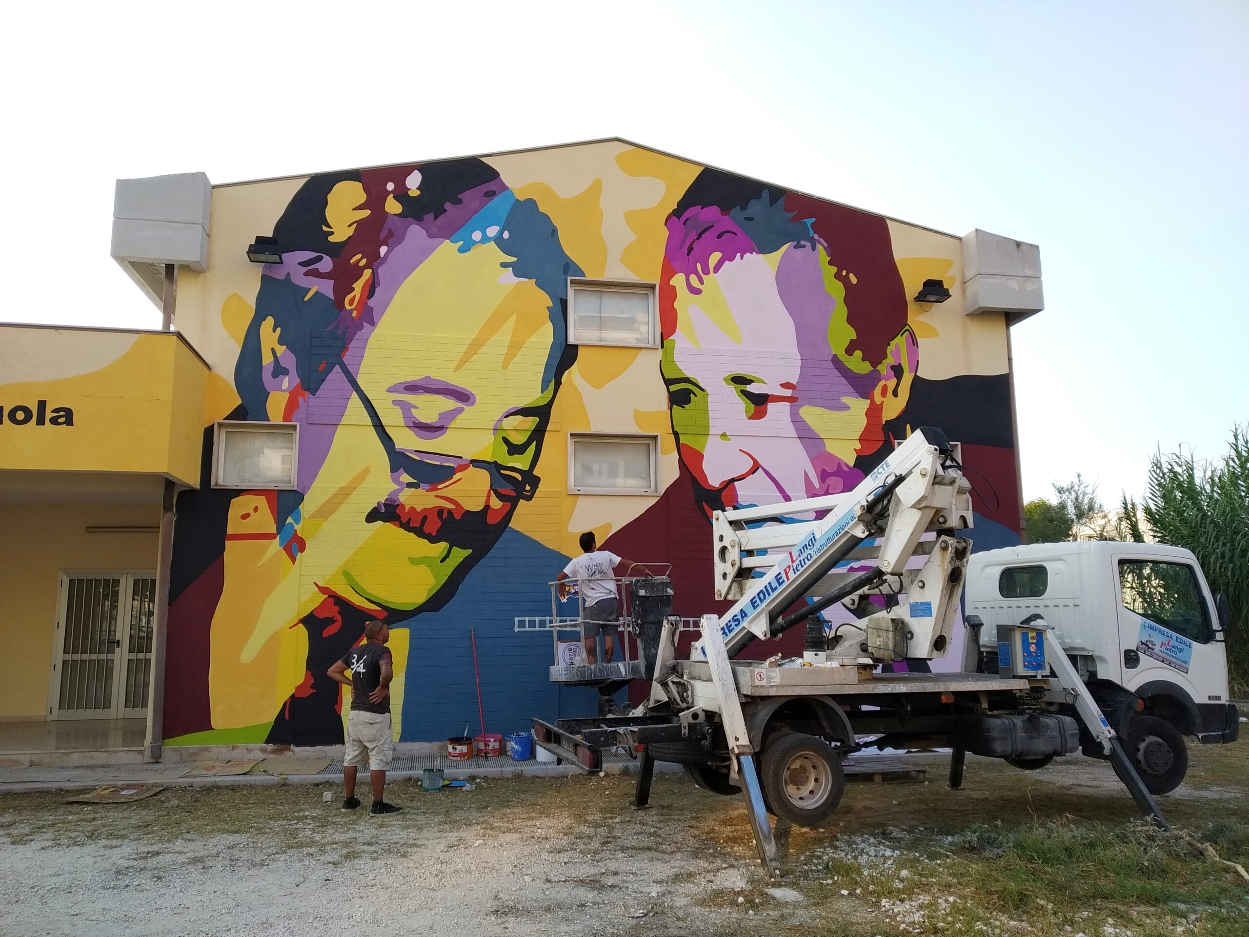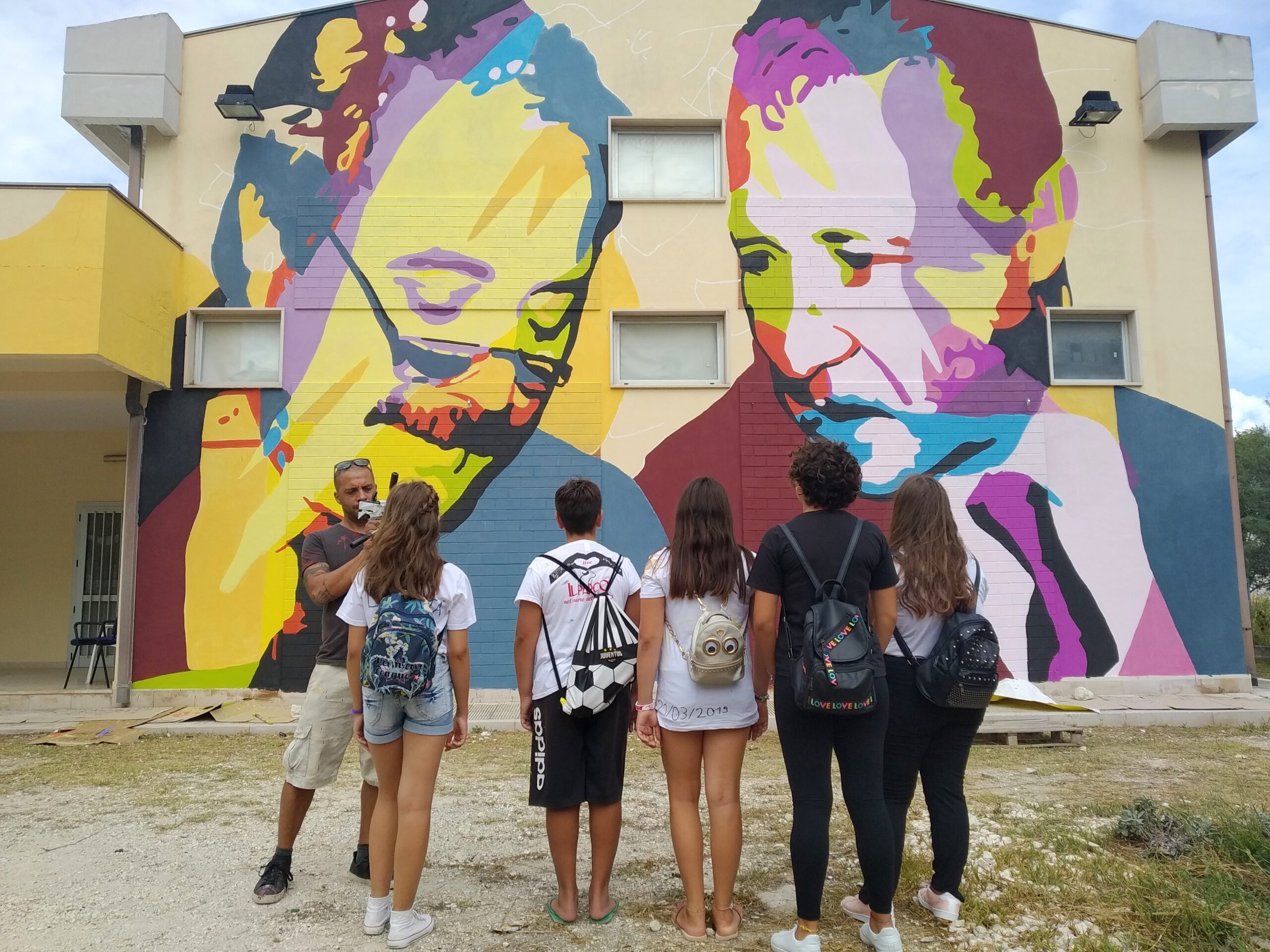 On 12 September 2019, a few days before the beginning of the school year at the Secondary School of First Degree “Don Antonio Spalatro” in Vieste, on the façade of the auditorium, we created the mural that depicts judges killed in the mafia attack – Giovani Falcone and Paolo Borsellino, in the classic image that sees them together smiling. The initiative started from a “mini city council” of young people attending the Don Antonio Spalatro school who proposed the creation of a mural with this image as part of the legality project.