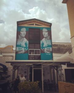 Dimitris Taxis through his mural described the moment of grape harvesting in a representative “frame”. “Viktoria”, the title of his work, an almost romantic image with warm and delicate tones presents a woman in the action of picking grapes at the center of a Salentine landscape during the harvest. A timeless synthesis that shows, at a glance, the relationship of exchange between man and his environment, inspiring the viewer to enrich the sense of identification with the land, the sense of love to their land and enforcing care for it.