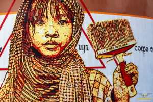 Farhan Siki, artista indonesiano di fama internazionale, ha dato avvio ai “lavori”, con la sua sorprendente visita, lasciando per la terza volta nel Salento, il suo indelebile segno sui muri del quartiere, creando un dipinto astratto, similmente ad una trama di alfabeti che mescolandosi e sovrapponendo, alludono alla bellezza della contaminazione dei linguaggi.